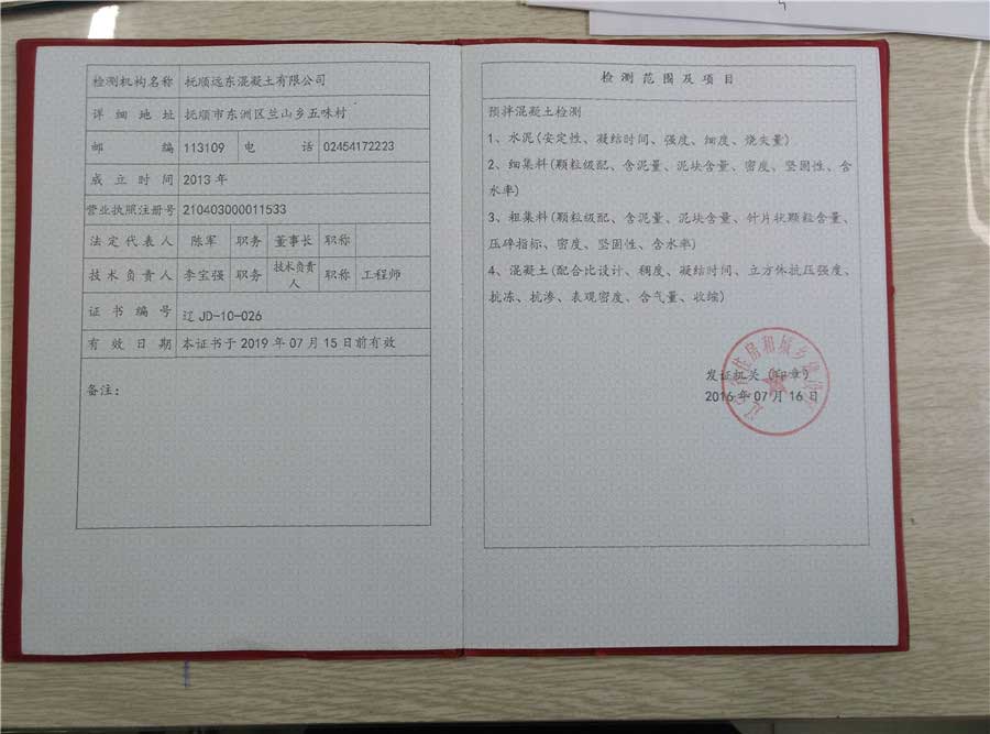 撫順遠(yuǎn)東混凝土有限公司 撫順遠(yuǎn)東混凝土有限公司成立于2013年3月,為招商股份制企業(yè),位于景色秀麗的石化工業(yè)園區(qū)內(nèi),占地面積2.8萬(wàn)平方米,交通便利,地理位置優(yōu)越。 遠(yuǎn)東混凝土有限公司生產(chǎn)經(jīng)營(yíng)C10—C60各種型號(hào)混凝土,擁有2條HZS—180微機(jī)全自動(dòng)控制混凝土生產(chǎn)線(xiàn),每條生產(chǎn)能力為180/小時(shí),擁有30臺(tái)15混凝土攪拌運(yùn)輸車(chē),配有輸送37米—52米高度的泵車(chē)6臺(tái),車(chē)載泵6臺(tái),為了滿(mǎn)足客戶(hù)冬季施工要求,配料系統(tǒng)均采用地下暖倉(cāng)式結(jié)構(gòu),設(shè)備性能可靠、計(jì)算精確、混凝土質(zhì)量穩(wěn)定,年生產(chǎn)能力可達(dá)60萬(wàn)。 遠(yuǎn)東混凝土有限公司擁有設(shè)備齊全的專(zhuān)業(yè)實(shí)驗(yàn)室,各類(lèi)實(shí)驗(yàn)儀器全部通過(guò)了撫順市技術(shù)監(jiān)督局的檢測(cè),實(shí)驗(yàn)員工均持證上崗,技術(shù)人員制定了科學(xué)合理的配合比,并建立了行之有效、有規(guī)范的試驗(yàn)操作管理制度,生產(chǎn)運(yùn)輸設(shè)備實(shí)行統(tǒng)一管理和調(diào)配,使混凝土質(zhì)量得到切實(shí)保障,可以滿(mǎn)足大小客戶(hù)的需要。 公司建立了以總經(jīng)理、總工負(fù)責(zé)制的質(zhì)量管理體系。擁有一支管理經(jīng)驗(yàn)豐富、生產(chǎn)質(zhì)量技術(shù)過(guò)硬、熟練掌握混凝土生產(chǎn)的技術(shù)骨干隊(duì)伍,F(xiàn)有職工80名,其中工程技術(shù)人員8名,中級(jí)職稱(chēng)2人,駕駛員、操作員全部經(jīng)嚴(yán)格培訓(xùn)上崗。 公司秉承“品質(zhì)源于厚道,口碑來(lái)自客戶(hù),強(qiáng)化細(xì)節(jié),贏(yíng)在執(zhí)行”的企業(yè)文化,堅(jiān)持“質(zhì)量第一,信譽(yù)至上”的經(jīng)營(yíng)宗旨,奉行“崇尚管理,注重質(zhì)量”的經(jīng)營(yíng)理念,為促進(jìn)撫順城市建設(shè)和經(jīng)濟(jì)發(fā)展做出應(yīng)有的貢獻(xiàn)。